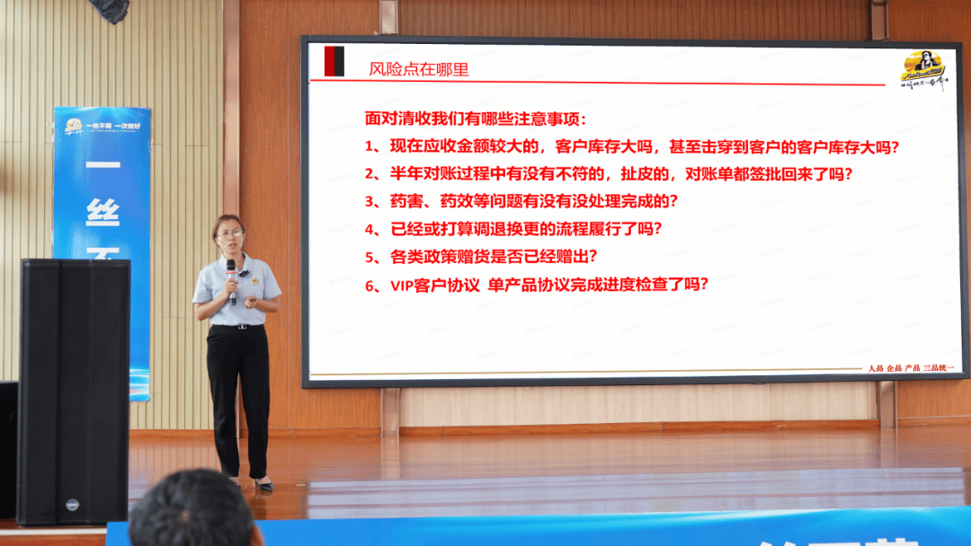 财务中心财务经营部部长孙海燕深入剖析了当前营销工作中的风险点。从客户结构看,距离二八法则还有一定差距,客户质量有待进一步优化。应收账款方面,针对不用战区以及同期对比进行了分析,提出了清收可能面临的风险,提前预警。她强调,需全面排查客户库存、对账差异、药害处理等潜在风险,确保应收颗粒归仓。
