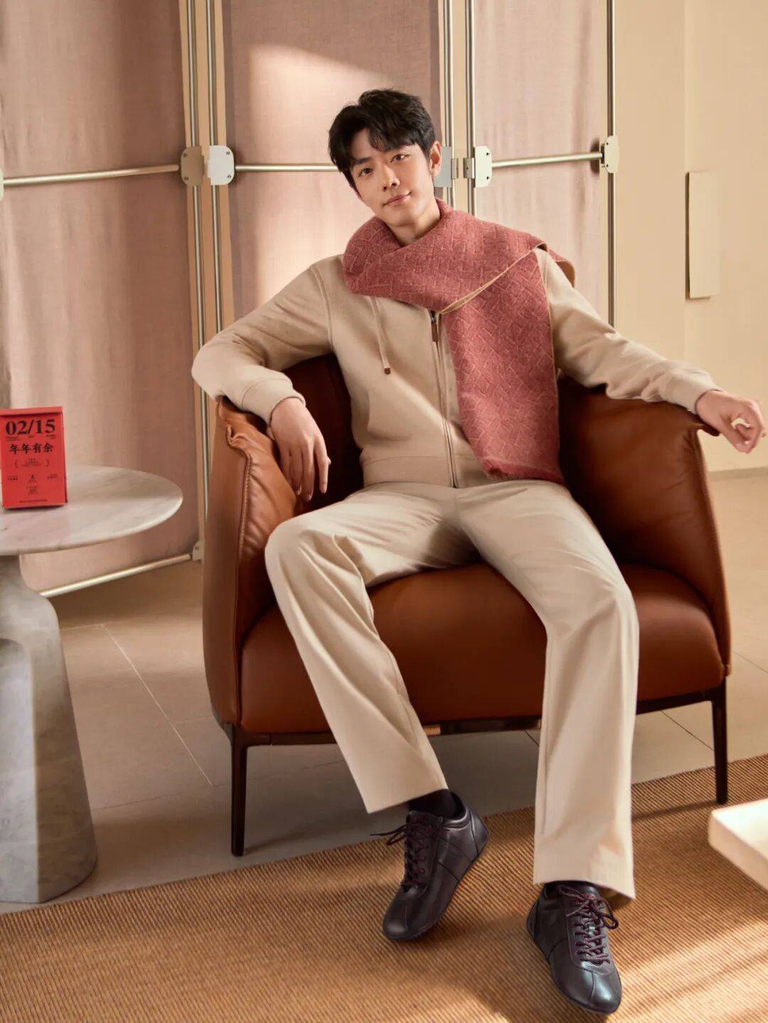 相比整身全红造型,在内搭或配饰部分以红色点睛,正是许多年轻男士的选择。参考肖战,用Tod’s低饱和色红围巾来点睛造型,想必也很适合举家其乐融融的氛围。