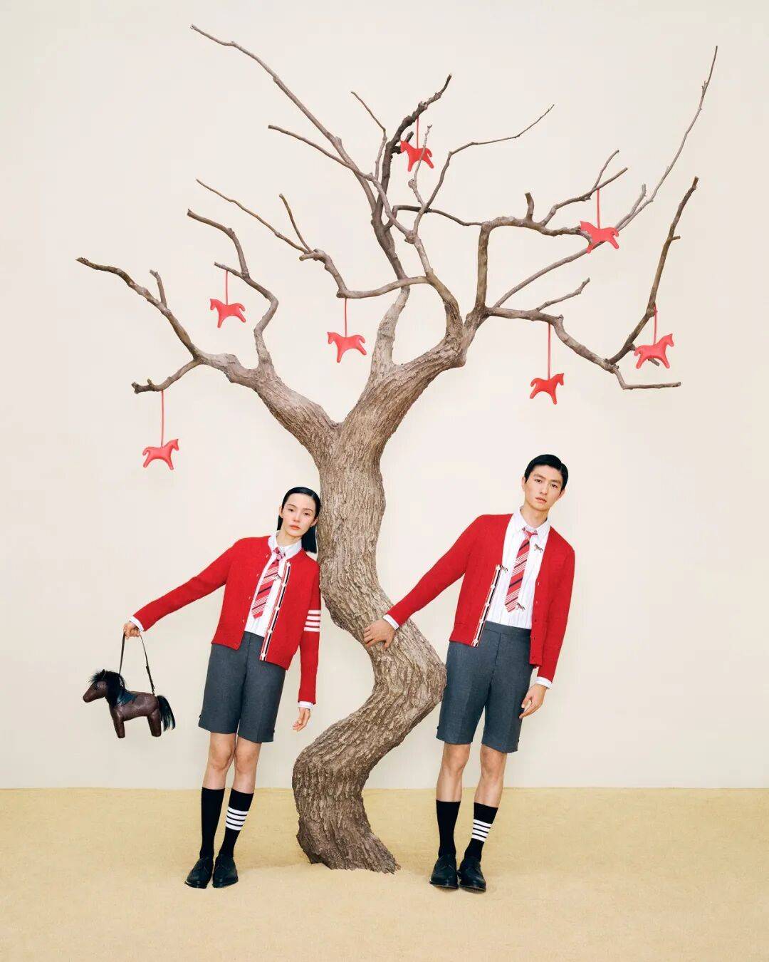 无论回家团聚还是见家长,情侣档一起大胆穿红一定不出错,比如金大川、雎晓雯这一对。同款Thom Browne新春红针织开衫搭配红色斜纹领带,将新年装扮的时尚感拉满。