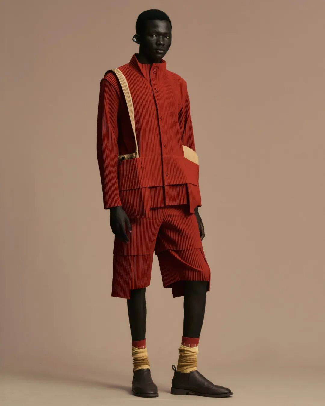 Homme Plissé Issey Miyake Men的这身红色套装,大概更符合文艺型男的品味,面料和版型都足够舒适,大面积的红色也不会过于张扬,也很适合旅行时穿着。