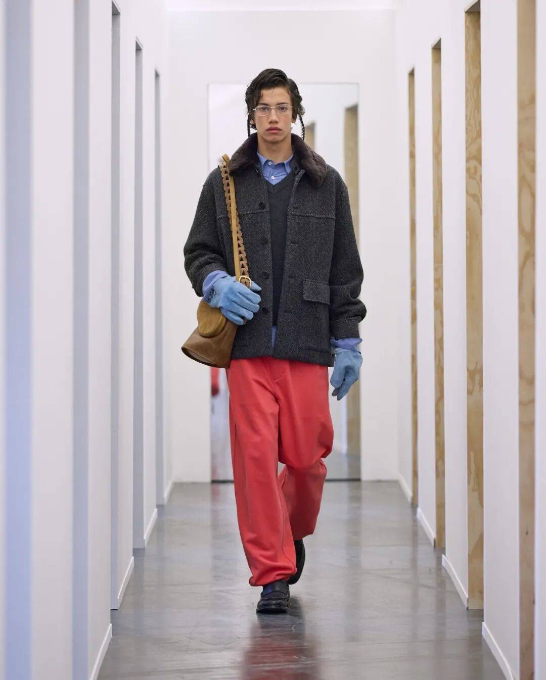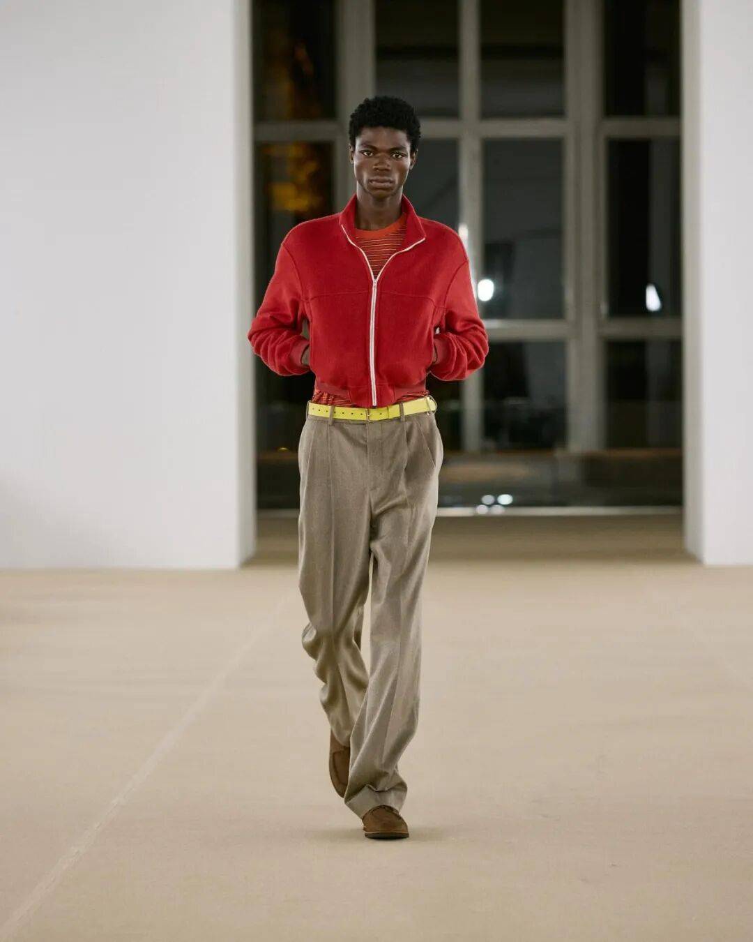东京品牌Auralee在巴黎秀场发布的红色拉链运动衫也是个好选择,搭配卡其色西装裤,又是另一种感觉;而另一套来自Dual Shift的造型更加大胆地颠覆常规,它用偏正装的翻领外套混搭休闲十足的红色运动裤,彰显独特个性。